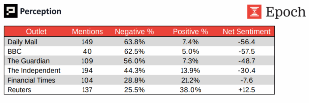 A 125-point perception gap exists between conference attendees (+90 positive) while tech media is generally negative at (-35). UK outlets show 56-64 percent negativity, 2-3 times international averages.