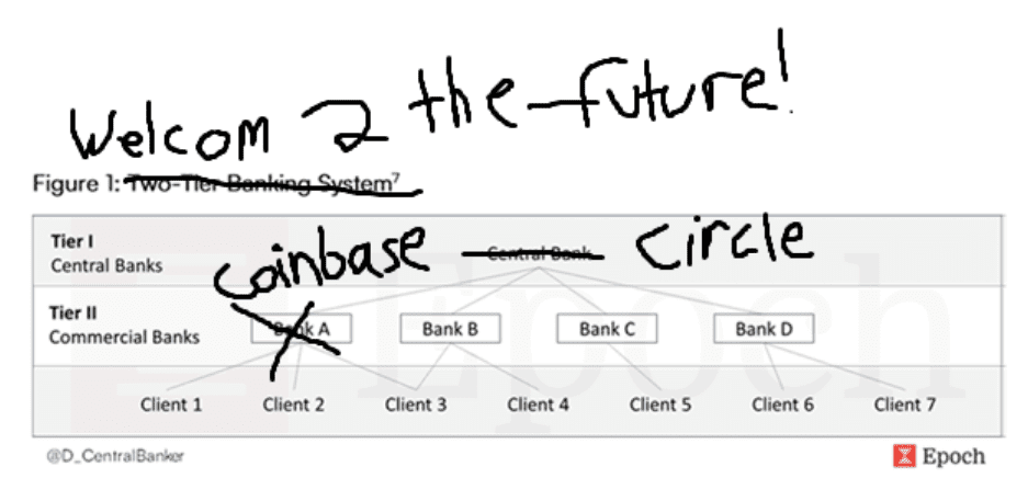 Last year, in our Bitcoin Banking Report, we discussed the structure of the 2-tier banking system in the US (see figure below). In this system, the Central Bank pays a yield on the deposits it receives from the Tier II Commercial banks, who then go on to share a portion of that yield with their depositors. Sound familiar?